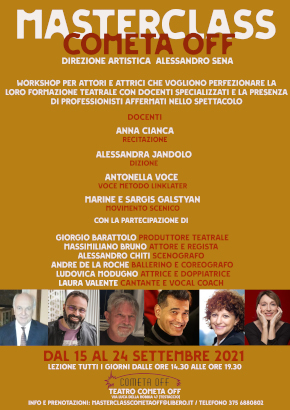 L’iniziativa, nata anche per incoraggiare la ripresa del Teatro, prende il nome di COMETA OFF MASTERCLASS, workshop teatrale reso prezioso dalla presenza di docenti di alto livello e riconosciute personalità dello spettacolo che daranno diretta testimonianza della loro professione ai partecipanti del seminario, attraverso una talk intervista con gli allievi, occasione di confronto e scambio reciproco.