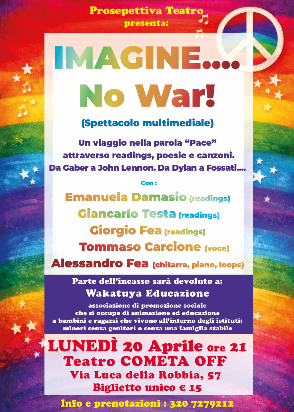 Spettacolo dedicato a testi, canzoni, poesie che hanno elaborato, sonorizzato, cantato la parola pace, e criticato la capacità dell'uomo di creare sempre continue guerre e distruzione