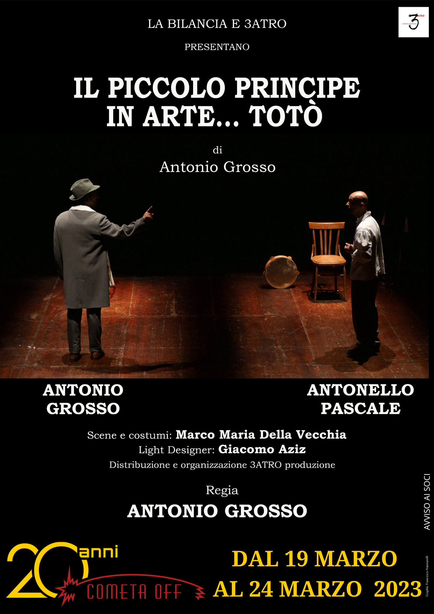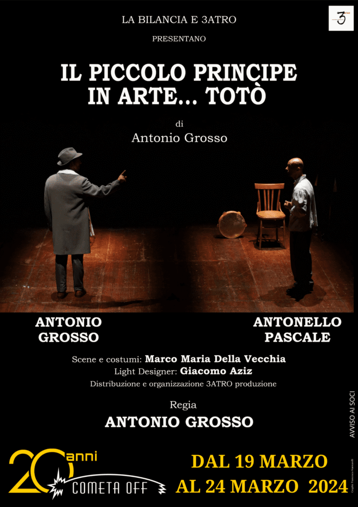Con Il Piccolo Principe in arte Totò, si vuole omaggiare la grandezza del Maestro, in tutte le sue forme, artistiche emozionali e psicologiche, dimostrando che dietro una delle più grandi Maschere del Cinema moderno si nascondeva un animo sensibile che, con tenacia, talento, passione ed umiltà e diventato un’icona della Comicità Archetipa, riconosciuta dai più grandi maestri del Novecento Italiano.