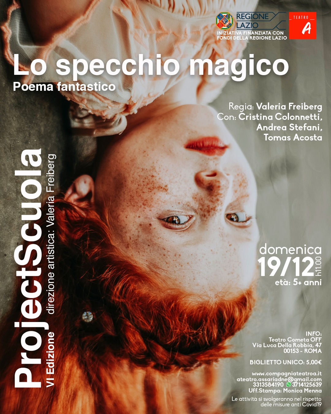 Domenica 19 dicembre vanno in scena al Teatro Cometa Off due spettacoli allestiti dalla Compagnia Teatro A: “Lo specchio magico, poema fantastico” (ore 11) e “Lettera a un giovane regista” (ore 17) diretti da Valeria Freiberg. Sono inseriti all’interno della rassegna Project Scuola VI edizione, iniziativa finanziata dalla Regione Lazio.