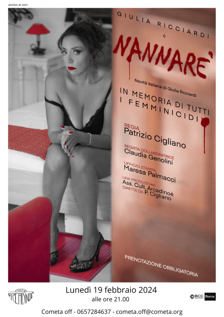 Nannarè è una puttana romana, già “matura”, che si racconta senza falsi pudori. Nell’ambiente “di lavoro” è stata ribattezzata Nannarè perché, con la sua romanità spudorata, la sua schiettezza ineluttabile, il suo aspetto e i suoi colori ricorda l’indimenticata Anna Magnani. E’ una donna del popolo, e forse la troviamo durante un interrogatorio di fronte alla Polizia. O forse no. A chi parla? Con chi, si mette così a nudo mostrando anche le sue molte fragilità? Parla di una vita difficile, faticosa, pericolosa, lasciandoci intuire le molte violenze cui è stata sottoposta fin da bambina,già obbligata a “battere” il marciapiede.