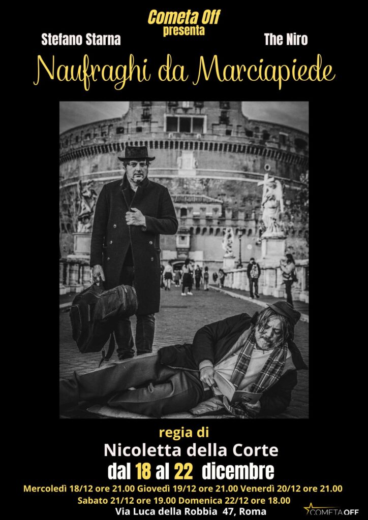 Naufraghi da marciapiede è un testo che trae ispirazione dalla vita di Evio Botta, senza fissa dimora sui generis con un passato da chef e artista che ha trascorso gli ultimi venti anni della sua esistenza a vivere o meglio sopravvivere a Roma.