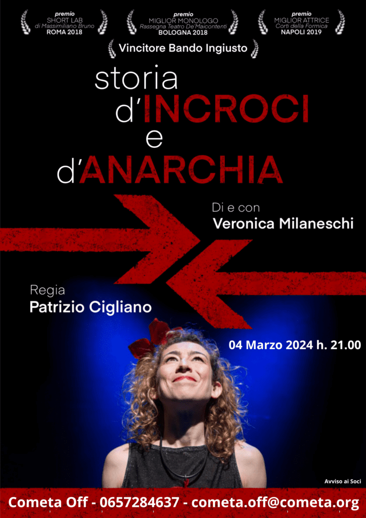 Torna in scena a Roma al teatro Cometa Off, “STORIA D’INCROCI E D’ANARCHIA”, monologo scritto e interpretato da Veronica Milaneschi, con la regia di Patrizio Cigliano.