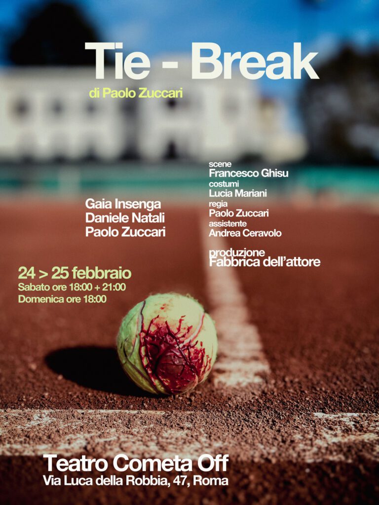“Tie-break” è uno spettacolo sulla fine. Di una partita di tennis, di un matrimonio, di un’amicizia, e di una vita. Il precipitare degli eventi è interpretato dai diversi punti di vista dei tre protagonisti che si intersecano in un contrappunto musicale svelando, anche con improvvisi squarci comici, i loro desideri sepolti da tempo.