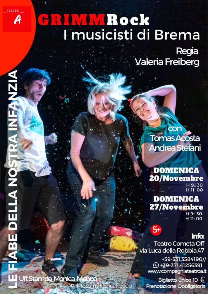 “GrimmRock” è uno spettacolo multimediale, coniuga teatro di prosa, poesia, musica, balletti e gioco. Si vuole coinvolgere i bambini nel gioco teatrale dandogli la possibilità di esprimere loro stessi. Protagonisti il giovane Trovatore e i suoi amici; un asino, un cane, un gatto e un gallo che giungono a Brema per allestire uno spettacolo musicale.